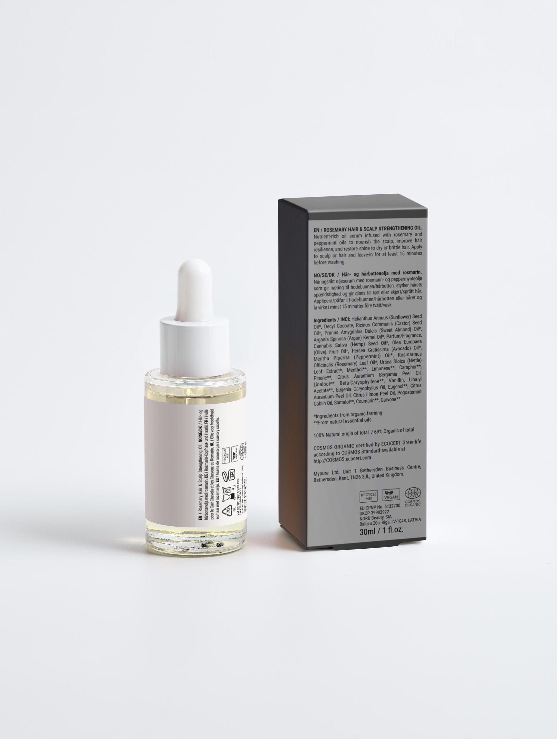 Ingredients: Rosemary Oil Almond Oil Peppermint Oil Helianthus Annuus (Sunflower) Seed Oil➀, Decyl Cocoate, Ricinus Communis (Castor) Seed Oil➀, Prunus Amygdalus Dulcis (Sweet Almond) Oil➀, Argania Spinosa (Argan) Kernel Oil➀, Parfum/Fragrance, Cannabis Sativa (Hemp) Seed Oil➀, Olea Europaea (Olive) Fruit Oil➀, Persea Gratissima (Avocado) Oil➀, Mentha Piperita (Peppermint) Oil➀, Rosmarinus Officinalis (Rosemary) Leaf Oil➀, Urtica Dioica (Nettle) Leaf Extract➀, Menthol➁, Limonene➁, Camphor➁, Pinene➁, Citrus Aurantium Bergamia Peel Oil, Linalool➁, Beta-Caryophyllene➁, Vanillin, Linalyl Acetate➁, Eugenia Caryophyllus Oil, Eugenol➁, Citrus Aurantium Peel Oil, Citrus Limon Peel Oil, Pogostemon Cablin Oil, Santalol➁, Coumarin**, Carvone➁