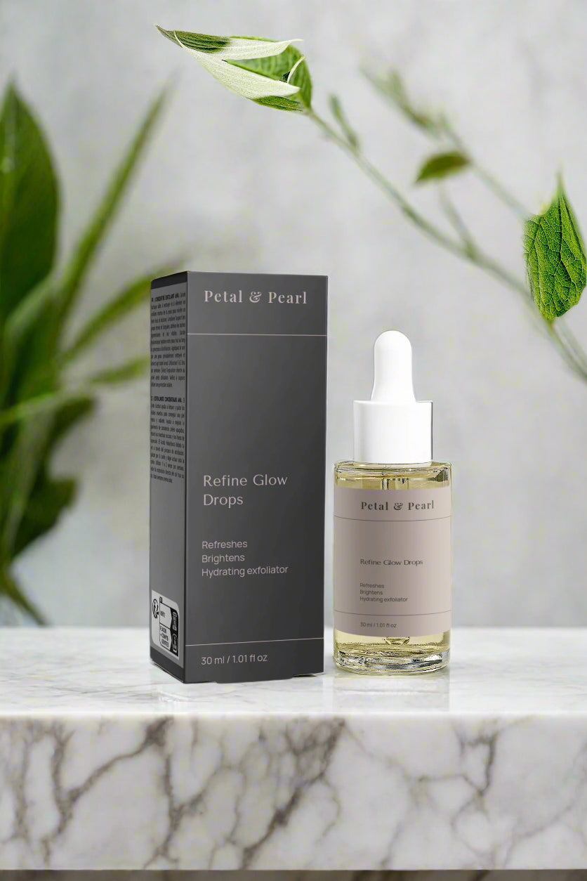 Refine Glow Drops: Gentle peeling formulated with 10% Lactic Acid that removes dead skin cells and promotes skin renewal.